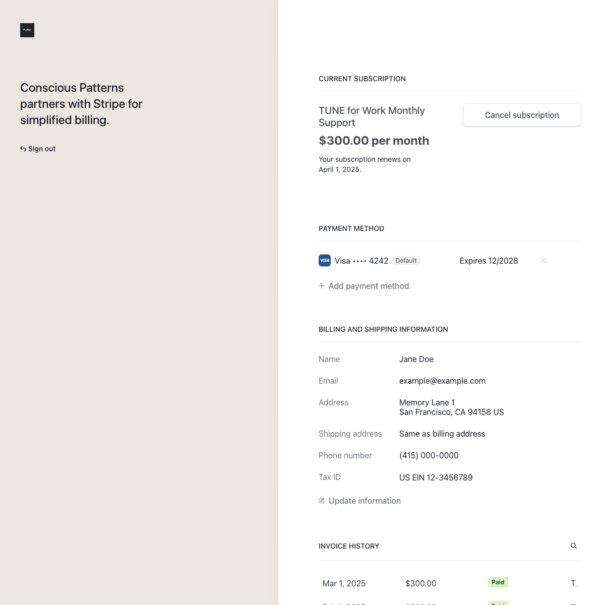TUNE memberships are ongoing subscriptions managed by the industry-standard third-party payment processor, Stripe. Your membership gives you access to ongoing content updates, and depending on your membership type entitles you to additional support resources. You can manage your subscription, including updating your payment method or cancelling your subscription, in the Customer portal.